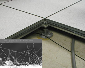 Zinc whiskers are a phenomenon that can occur on the bare metal surfaces of access flooring systems. Affected components include some wood-core and some concrete-core computer room flooring panels as well as some pedestals and stringers. The whiskers grow on the underside (plenum side) of the floor panels or the exposed surfaces of the structural components.